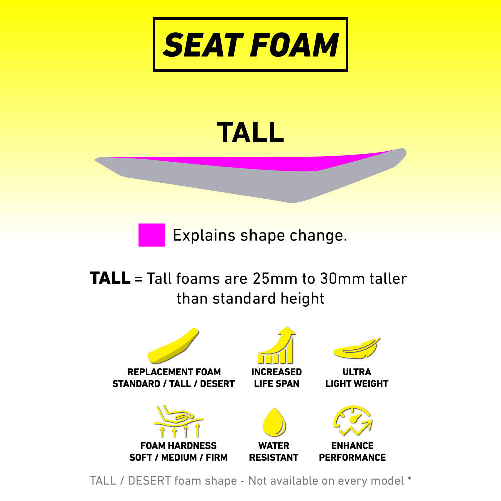 Foam Specs: · TALL Shape · 25mm to 30mm TALLER than standard seat foam height (Bike model variance) · Medium Firmness